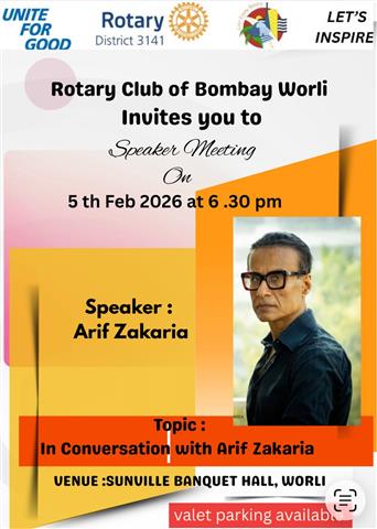 ROTARY CLUB OF BOMBAY WORLI HAS INVITED MR ARIF ZAKARIA TO SHARE ABOUT HIS UPCOMING PROJECTS